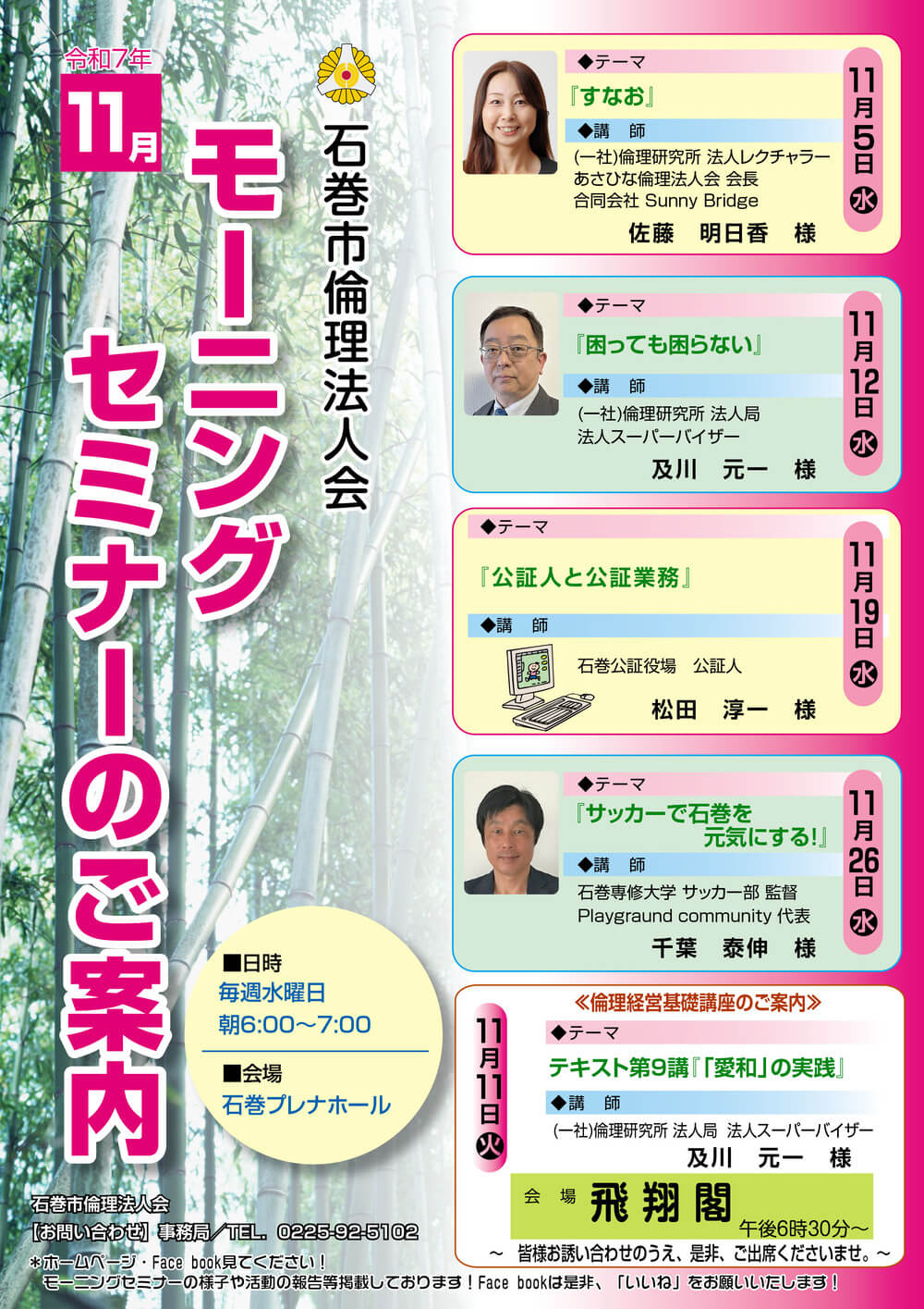 普段より倫理を学んでいる講師の方が、自らの経験をもとにお話しいただけるまたとない機会となりますので、興味のある方はぜひご参加の程よろしくお願いします。