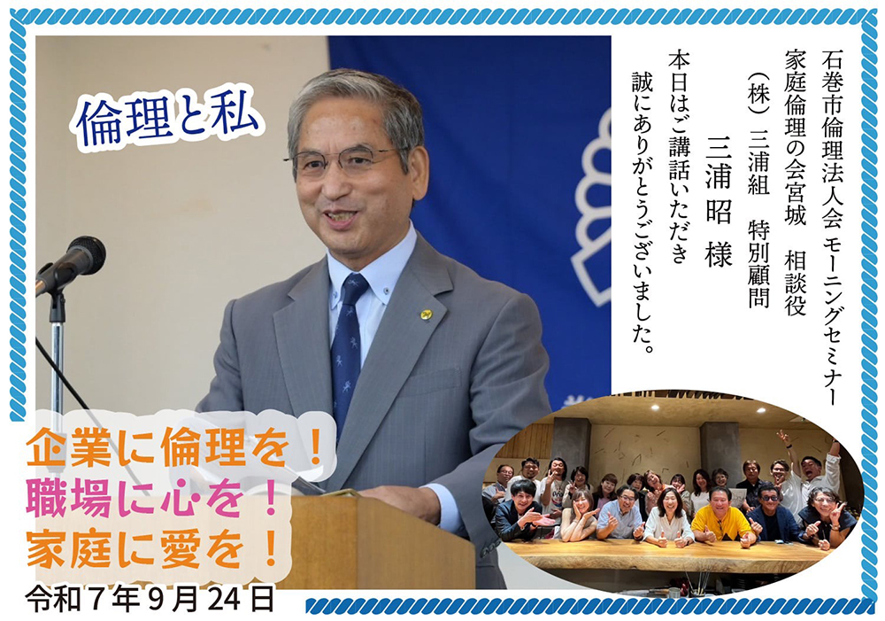 9月24日(水)第1749回モーニングセミナー、講師は家庭倫理の会宮城 三浦 昭 相談役です。