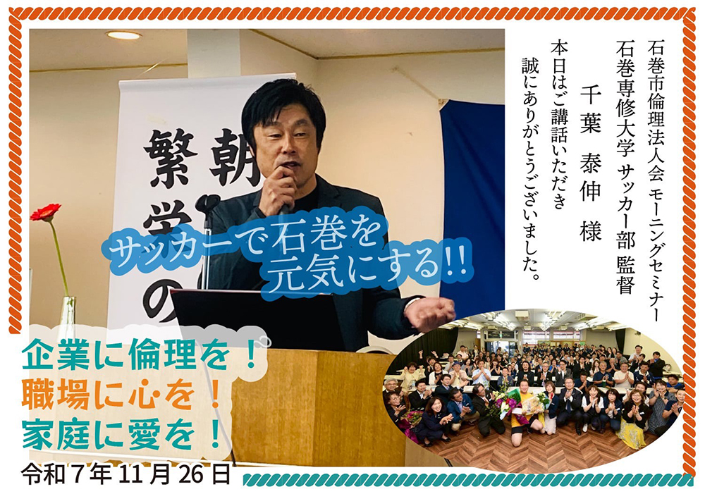 本日の第1758回モーニングセミナーは、石巻専修大学 サッカー部 監督でPlayground community 代表の千葉 泰伸 様を講師に迎え、『サッカーで石巻を元気にする!』というテーマでご講話をいただきました。