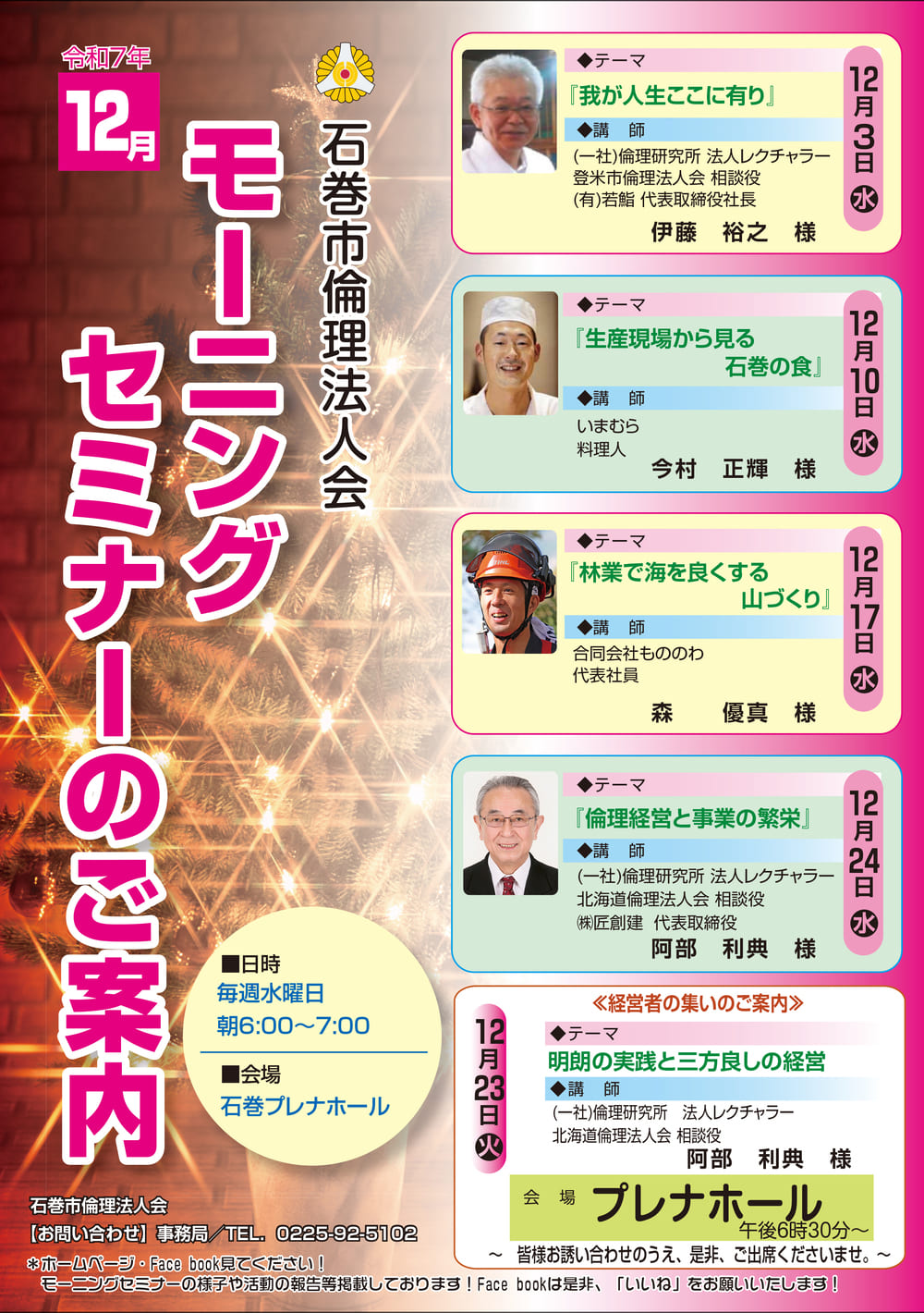 次回は12月3日(水)(有)若鮨 代表取締役社長 登米市倫理法人会 伊藤 裕之 相談役を講師に迎え、『我が人生ここに有り』というテーマでご講話をいただきます。