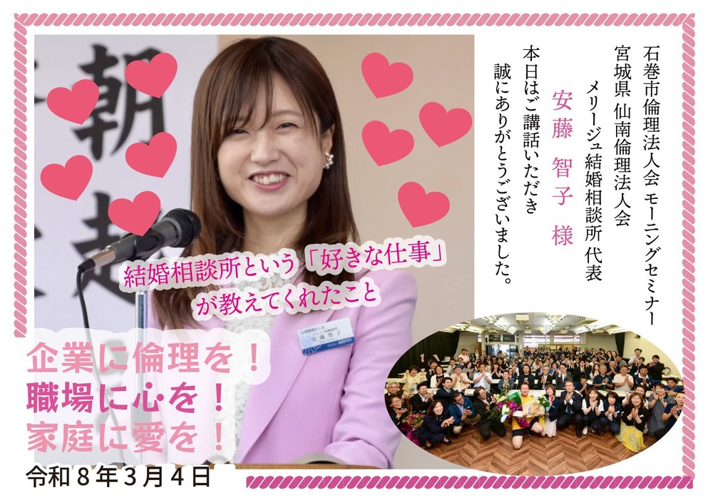 4日(水)のモーニングセミナーは、仙南倫理法人会 幹事 メリージュ結婚相談所 代表を務める 安藤 智子様が登場です。