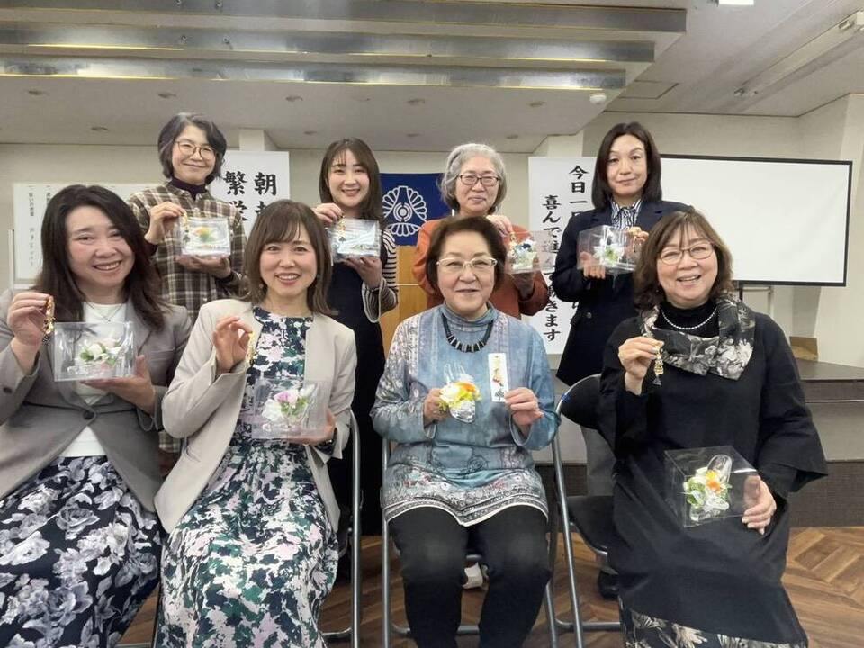 倫理法人会ではおなじみ、アトリエ華匠の大江 厚子先生によるプリザーブドフラワー&バックチャームづくりが和やかに開催されました。