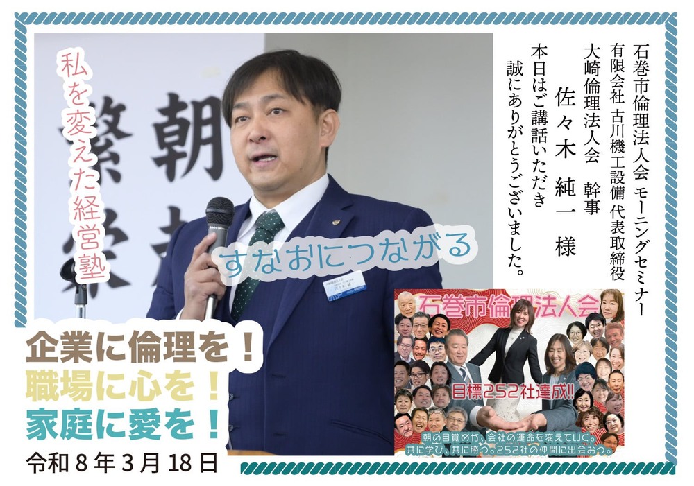 3月26日(木)はランチ会、4月14日(火)はマルホンまきあーとテラス様において『倫理経営講演会』が開催されます。