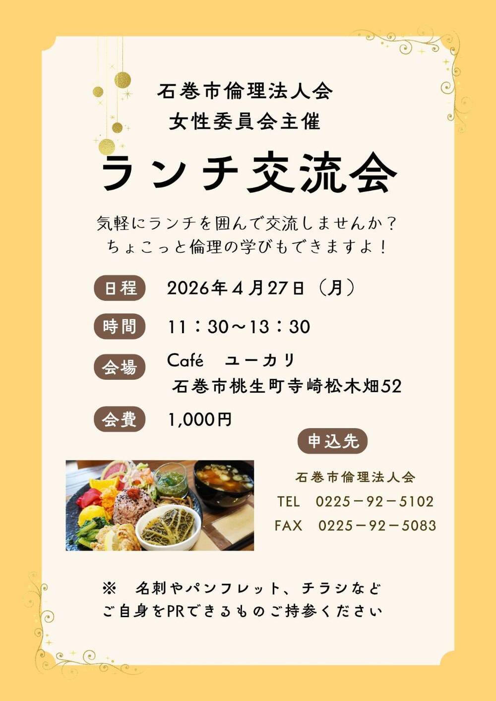 ①4月27日(月)ランチ交流会 桃生町寺崎Café ユーカリ様にて11時30分からです。