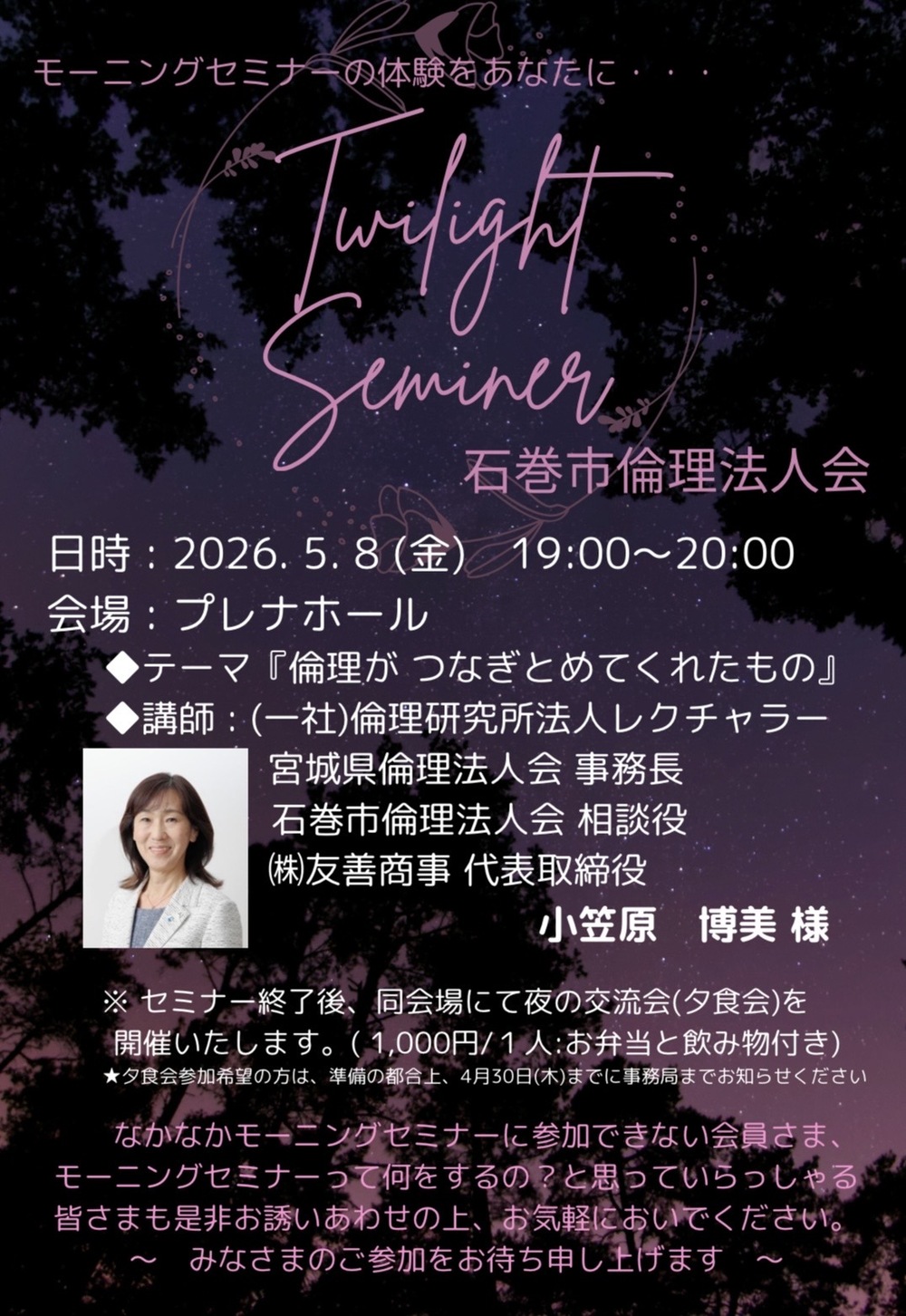 ②5月8日(金)トワイライトセミナー 石巻プレナホールにて夜7時からです。